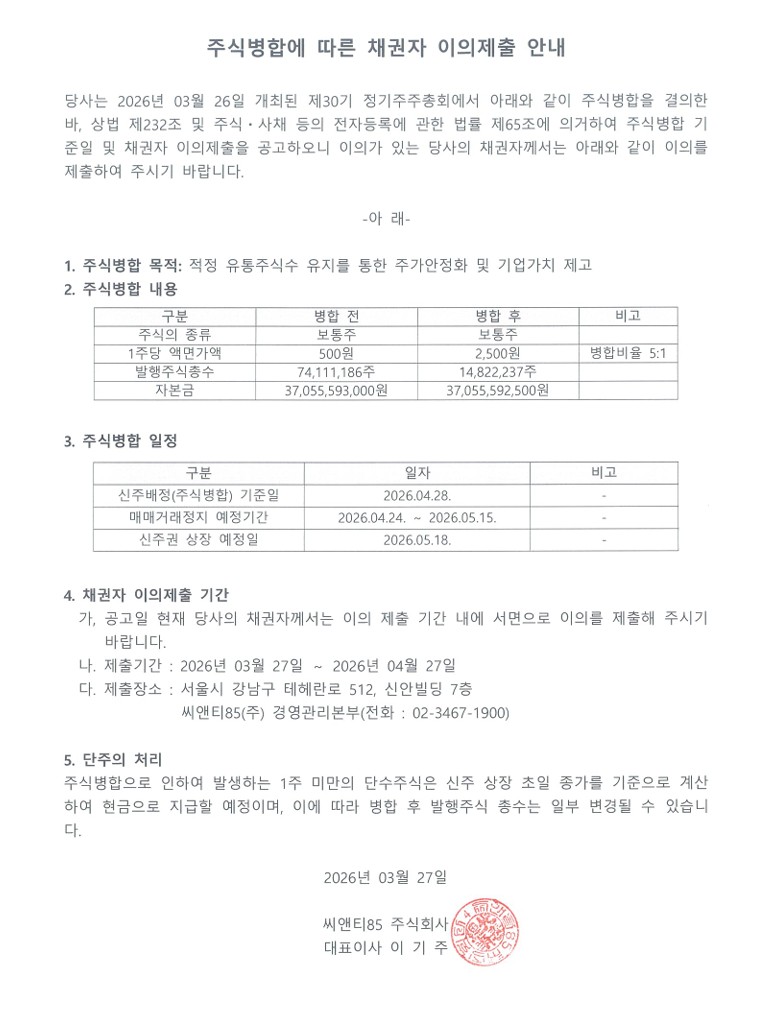 주식병합에 따른 채권자 이의제출 안내